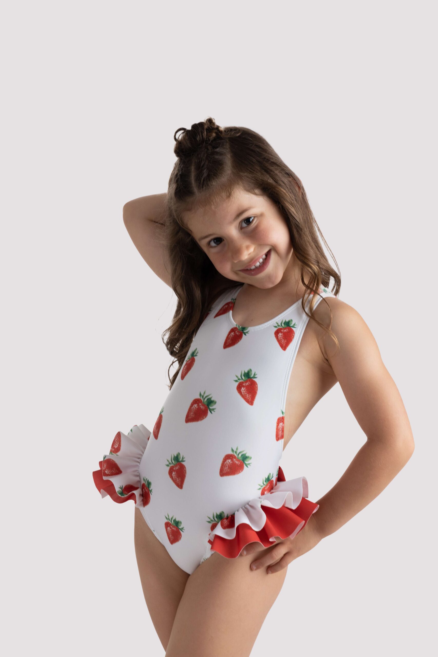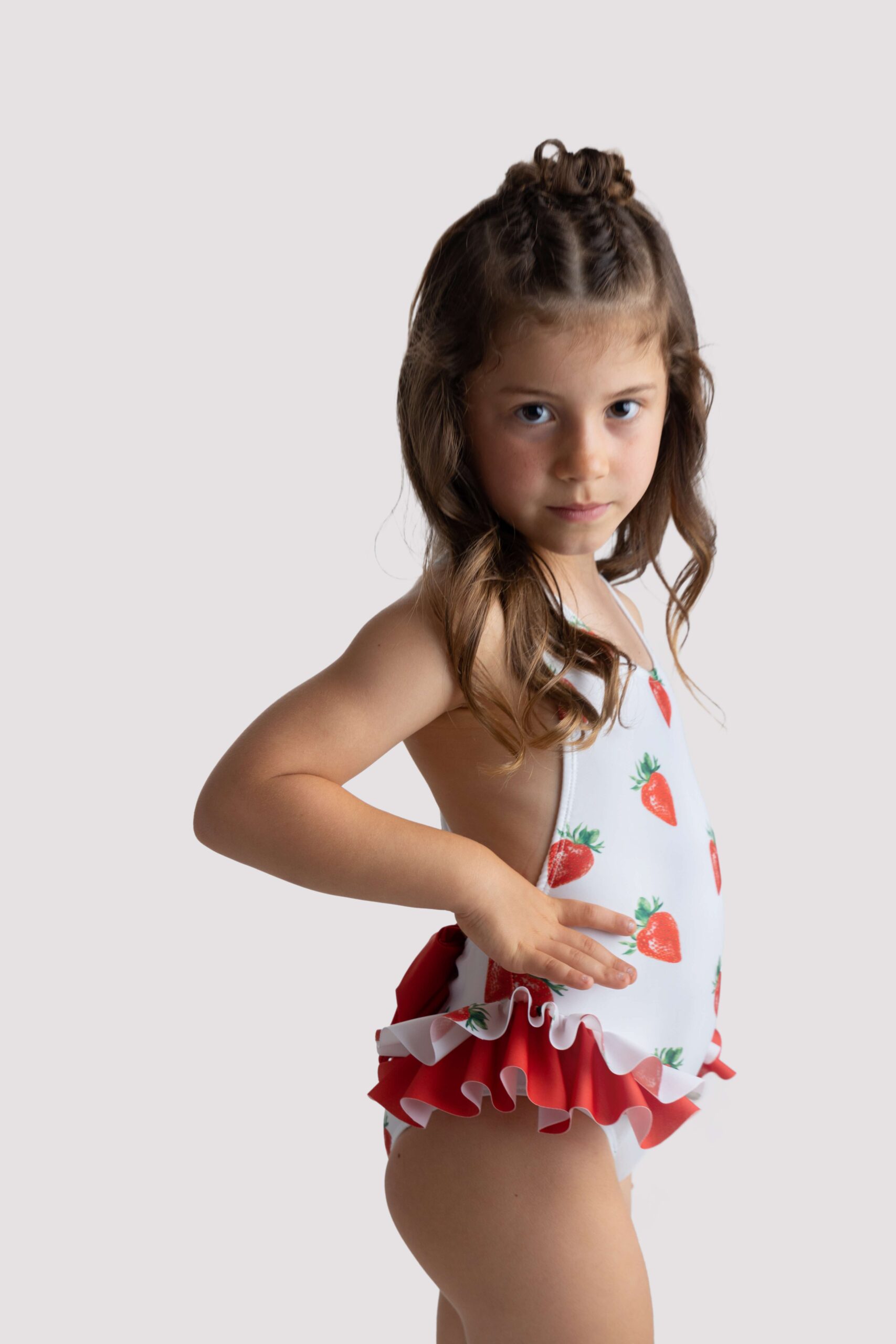 Fato de banho Cisnes. Fato de banho com gola em folho, pormenor de folho duplo e laços nas laterais . Costas cruzadas com acabamento em folho largo.