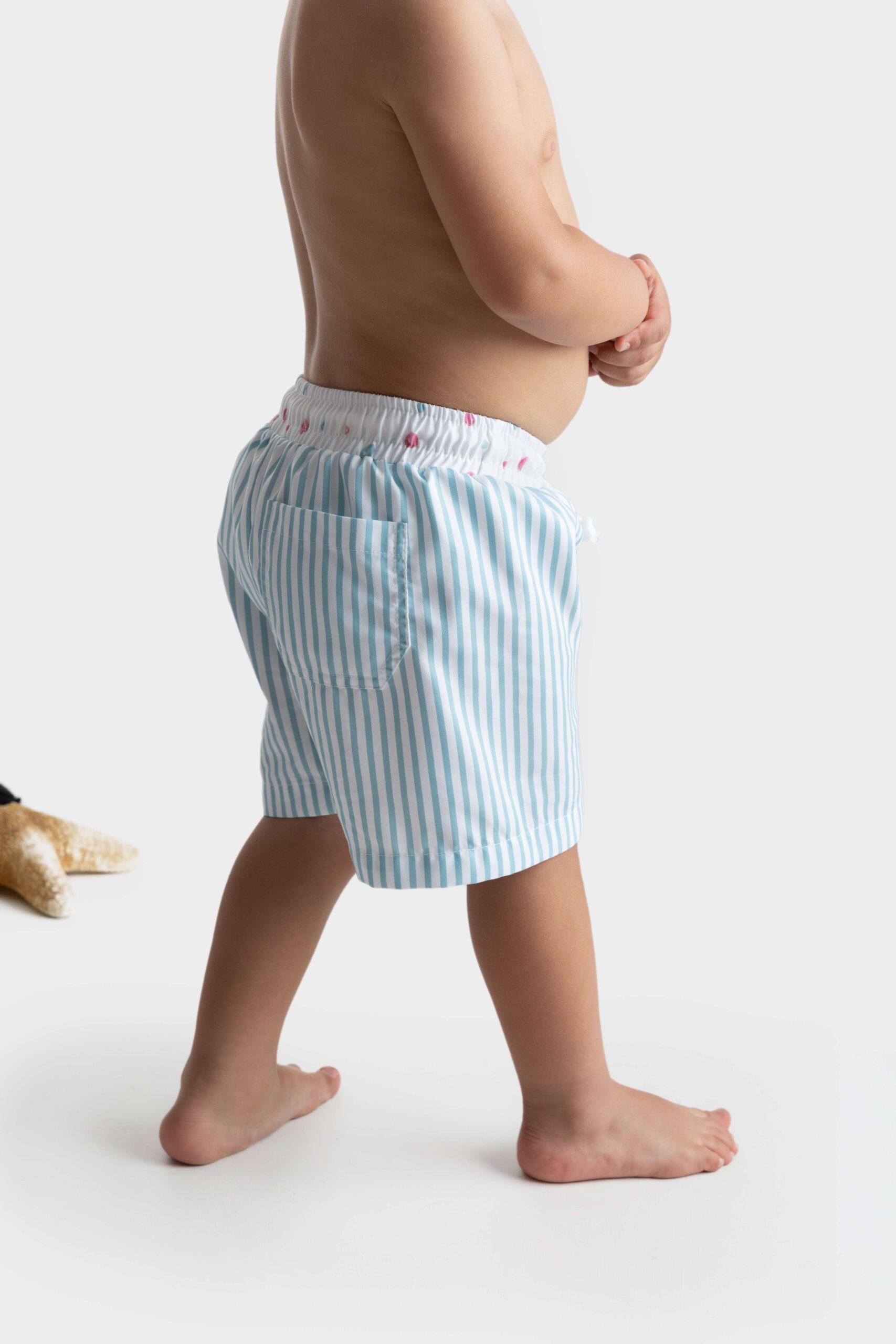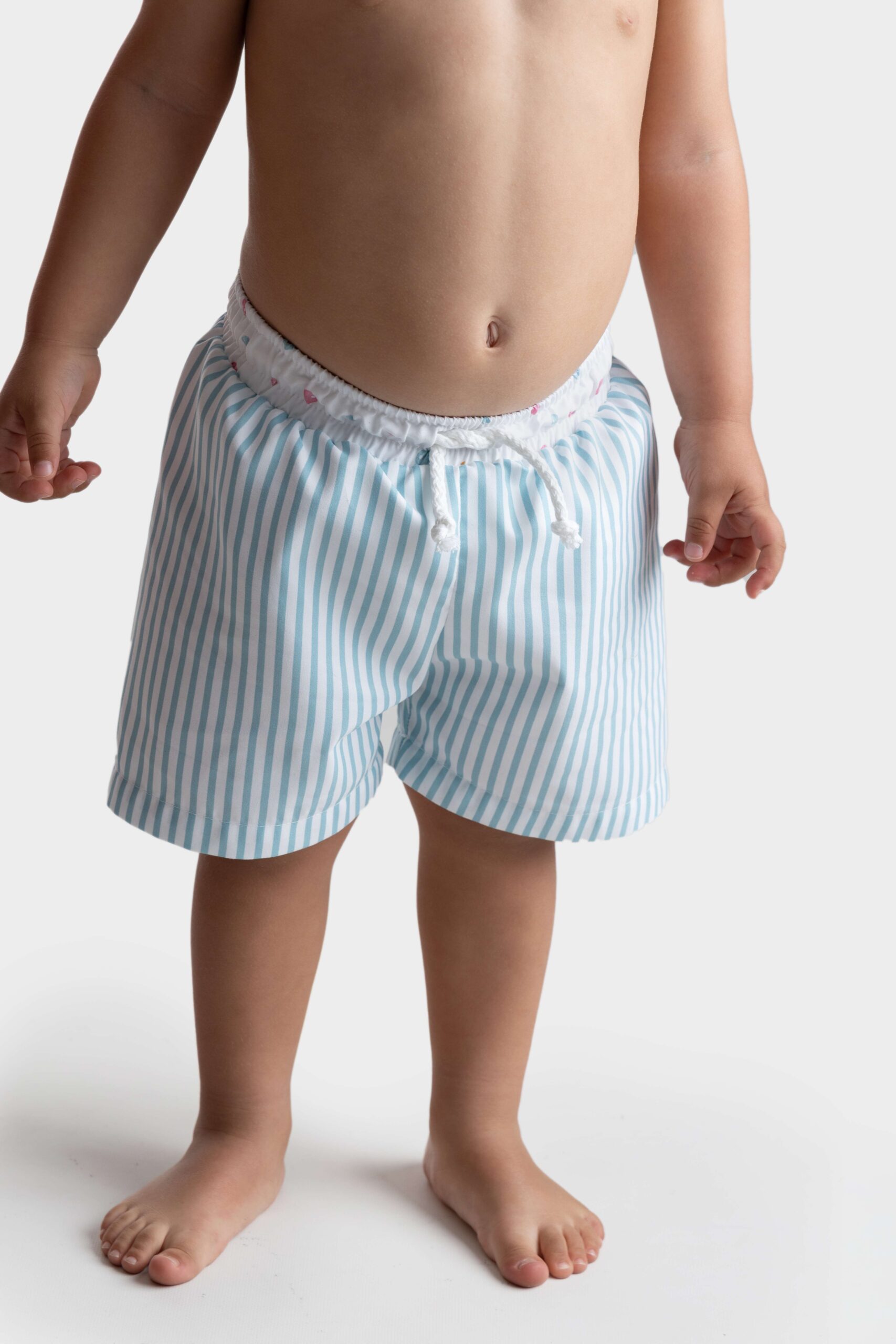 Calções de banho rapaz com forro e ajustável na cintura. Padrão com riscas pormenor na cintura.