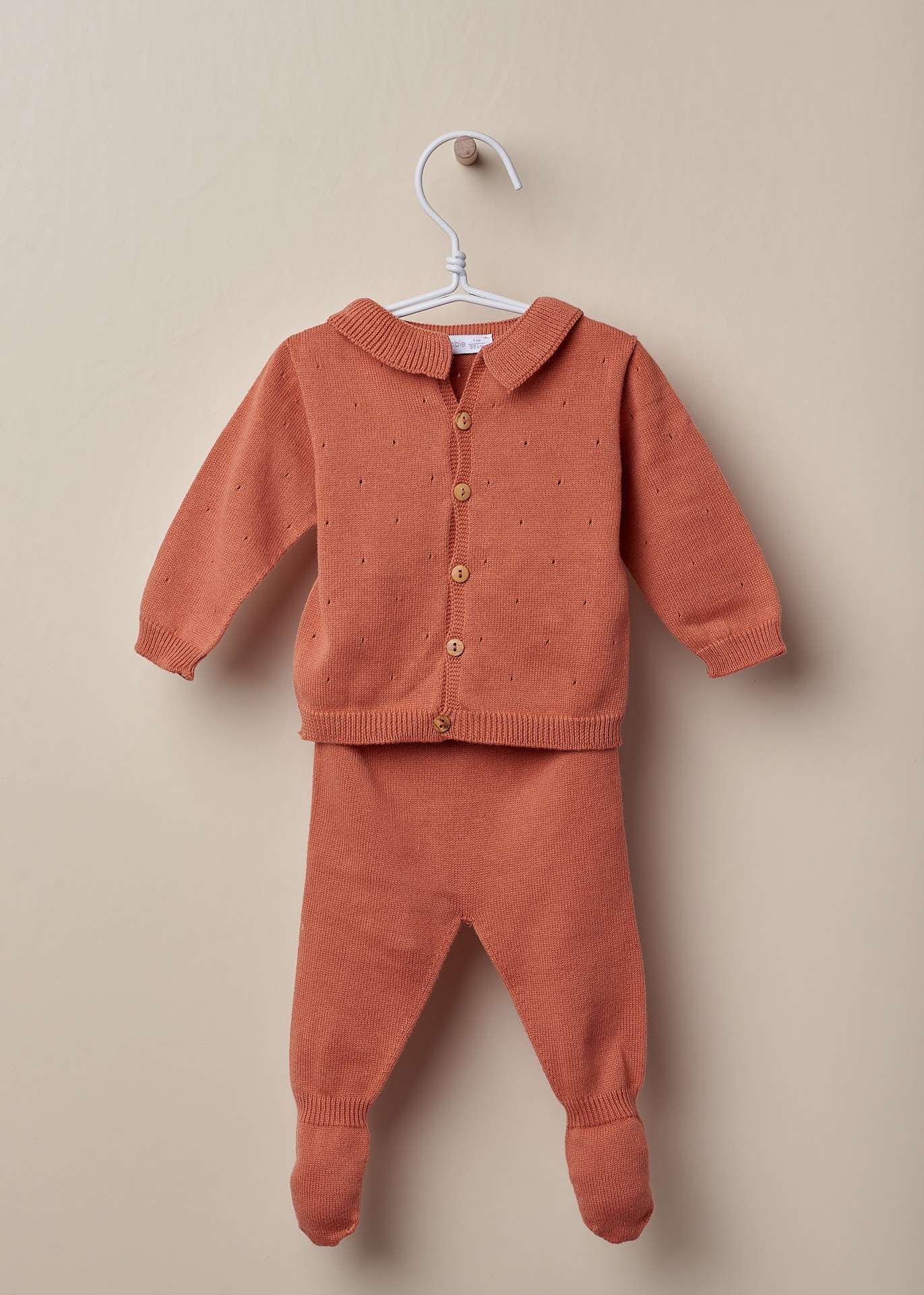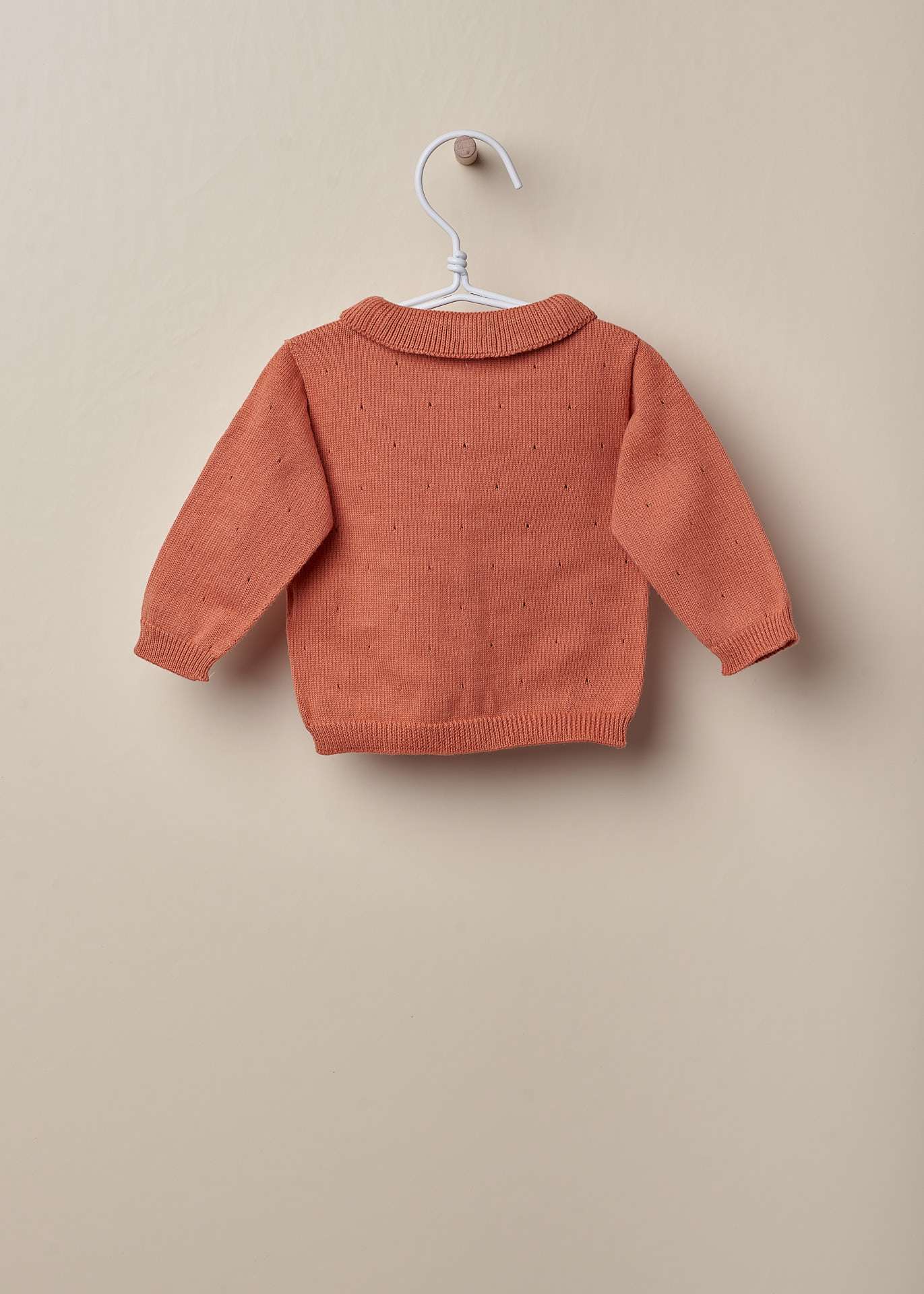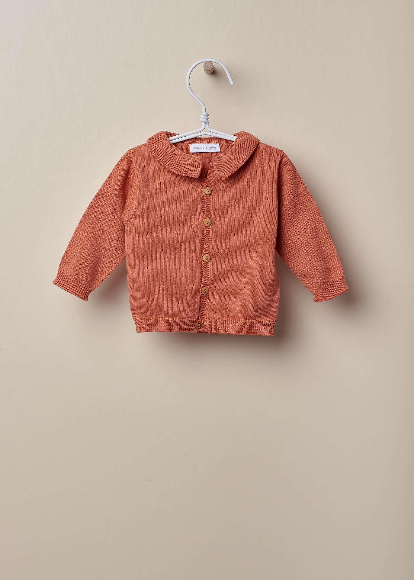Casaco de manga comprida tricotado em malha de algodão suave. O casaco TEXTURES TO MATCH aperta na frente com botões de madeira. Produzido em Wholegarment, uma peça completa sem costuras, para maior conforto do seu bebé.