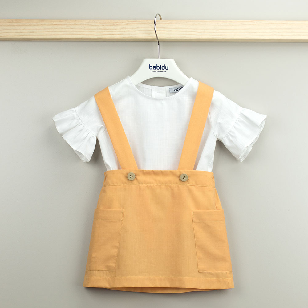 Conjunto da coleção Mia  composto por duas peças: saia e blusa. Saia com alças com bolsos frontais e botões em madeira, . Blusa de linho com manga em folhinho e abertura nas costas com botão em madeira,.