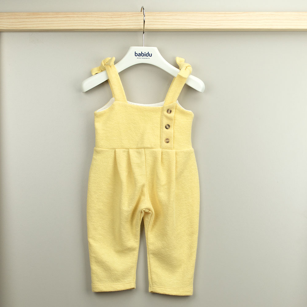 Macacão da coleção Alejandra, com alças e detalhe de botões em madeira