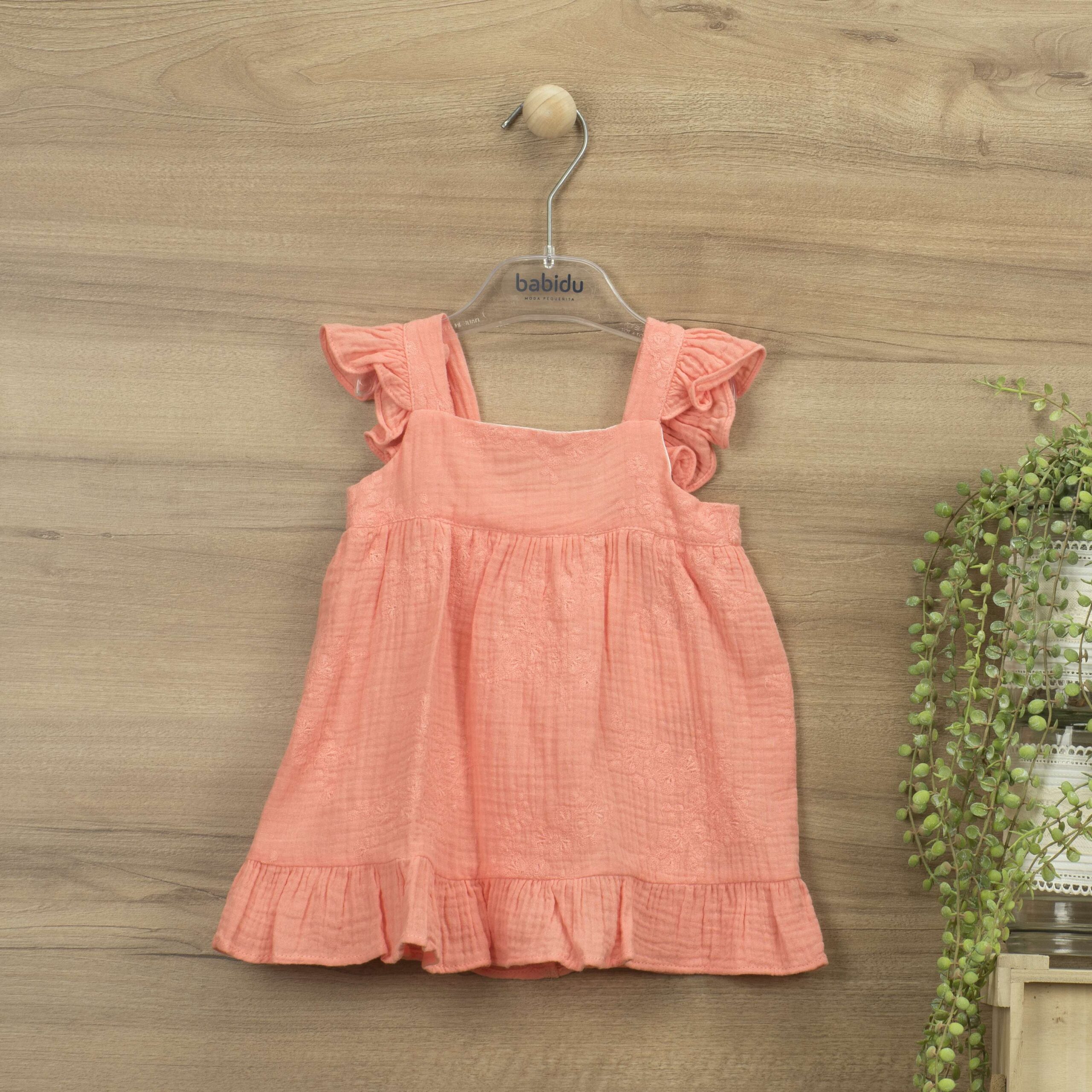Vestido em tecido de algodão suave com relevo de pequenas flores. Aperta nas costas com botões de madeira.