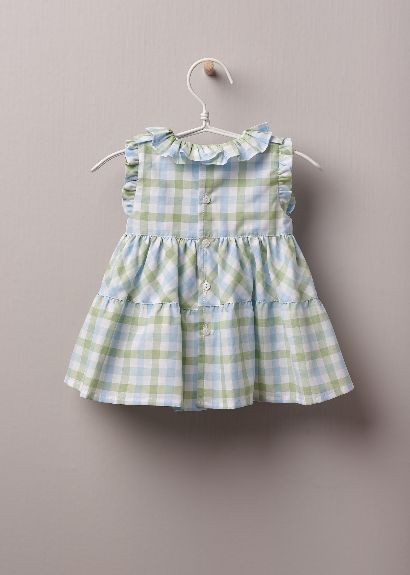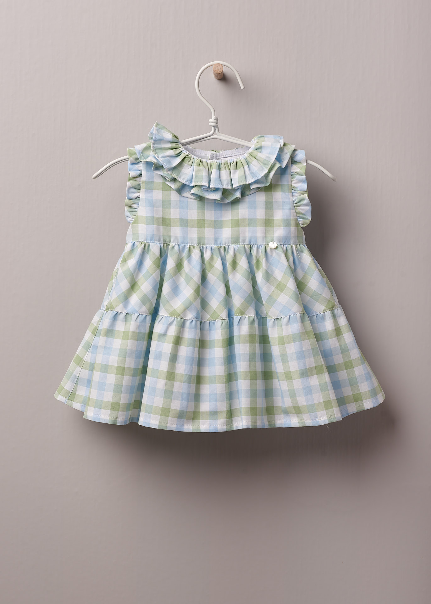 Coleção Botical Garden. Elegante vestido em xadrez com gola dupla de folhos e manga a cava com acabamento em folho . Abertura nas costas com botões madre pérola.